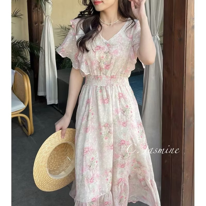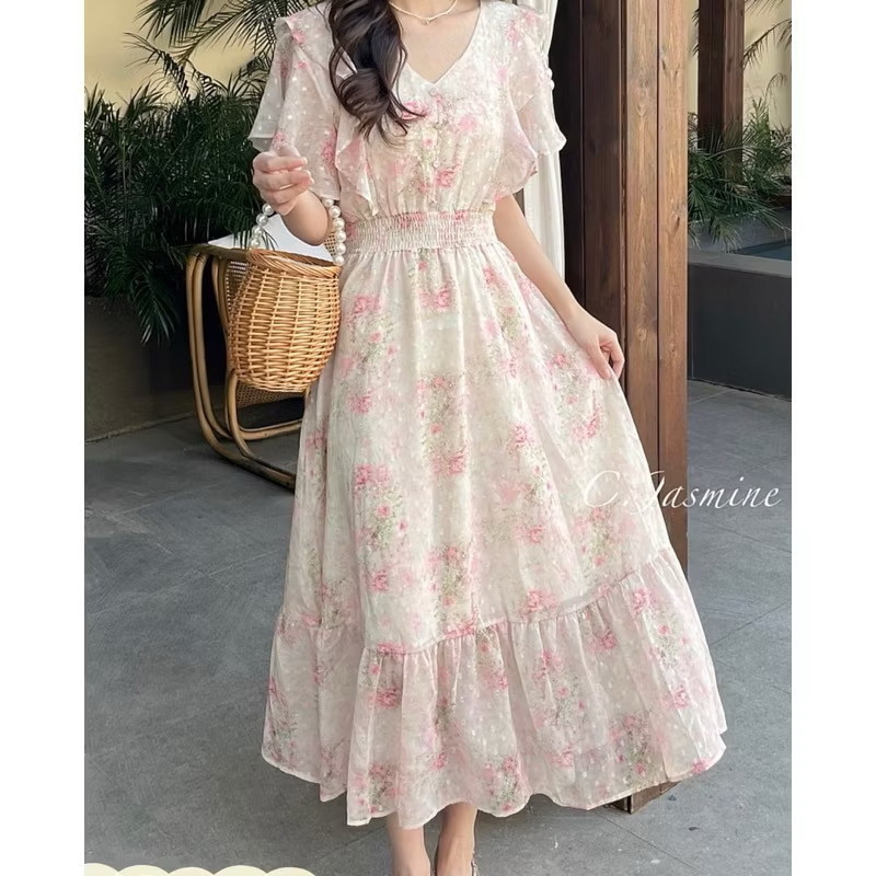 雪紡荷葉袖貓眼釦 鬆緊腰長洋裝