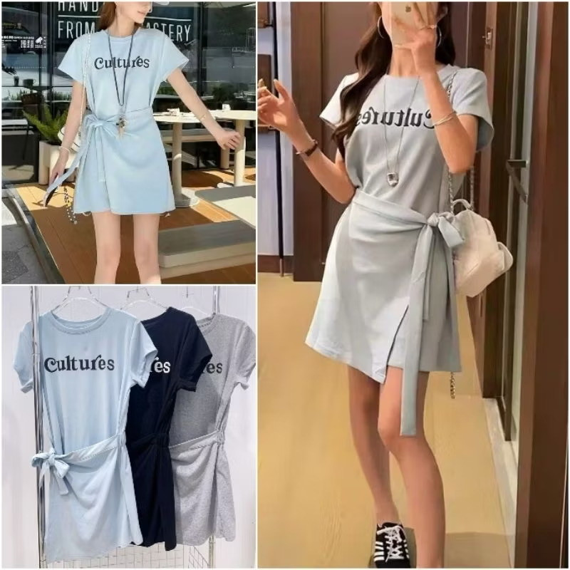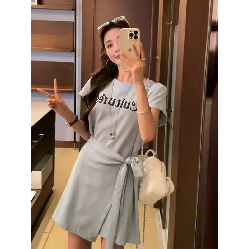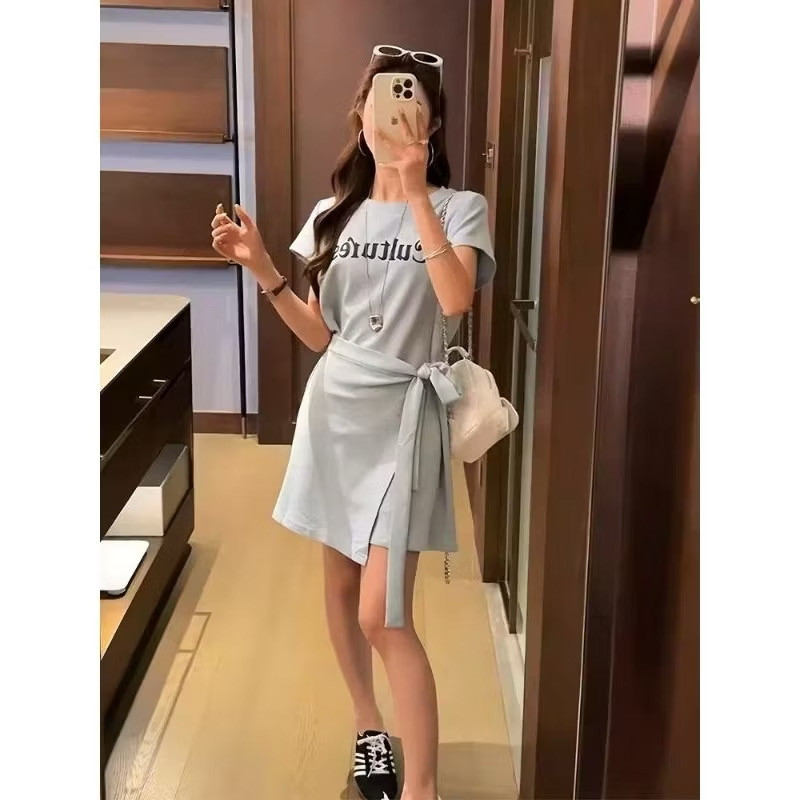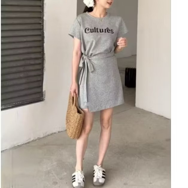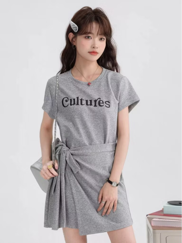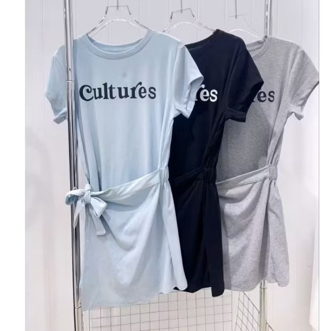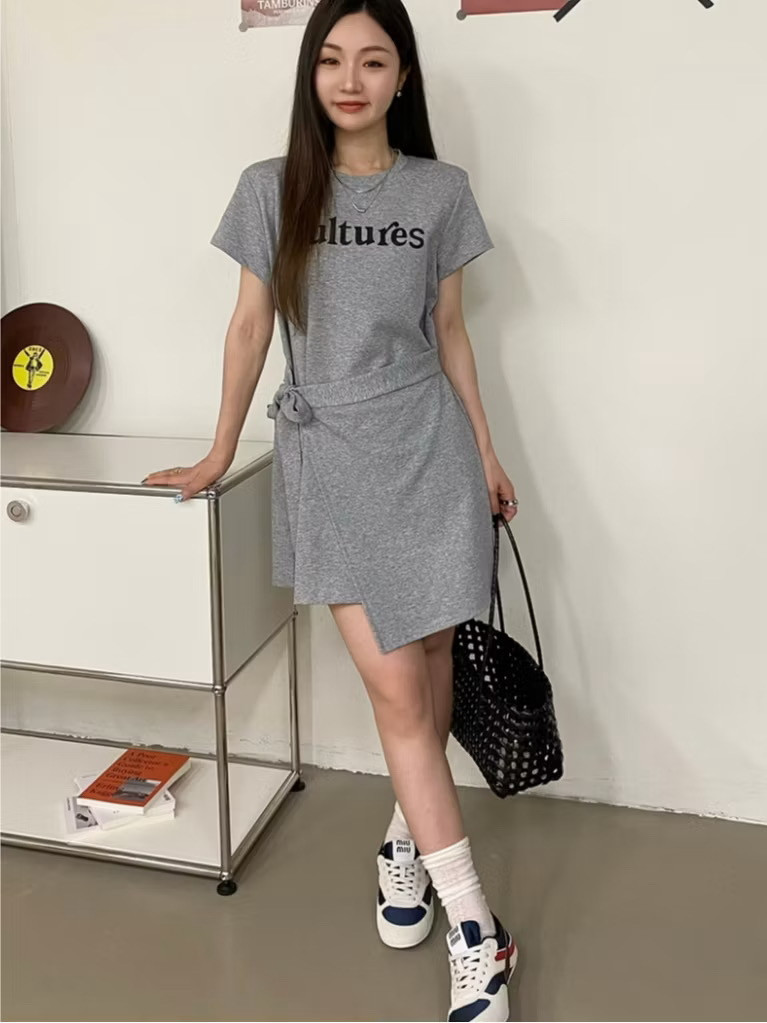 彈力涼感棉質側綁帶假兩件字母中長版上衣