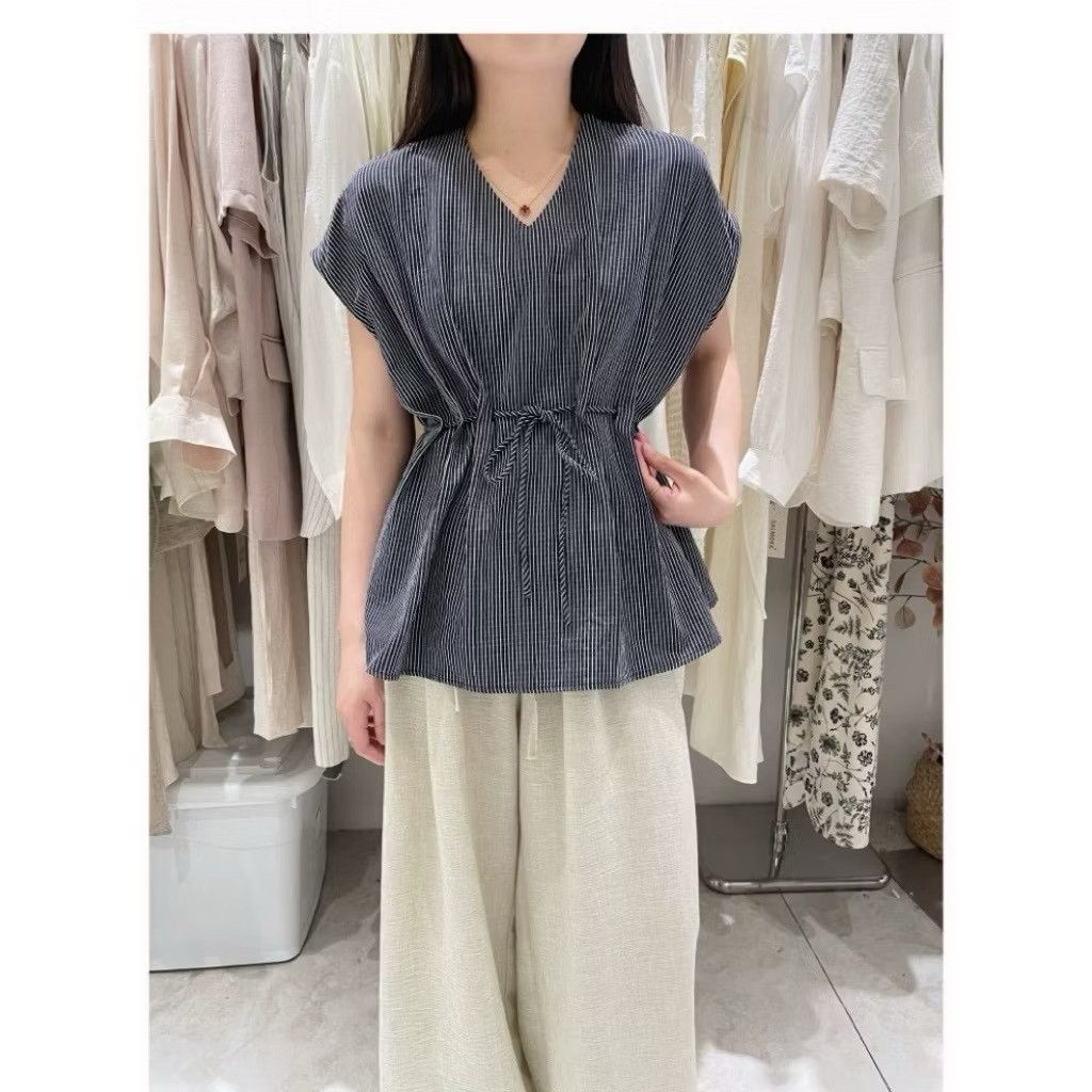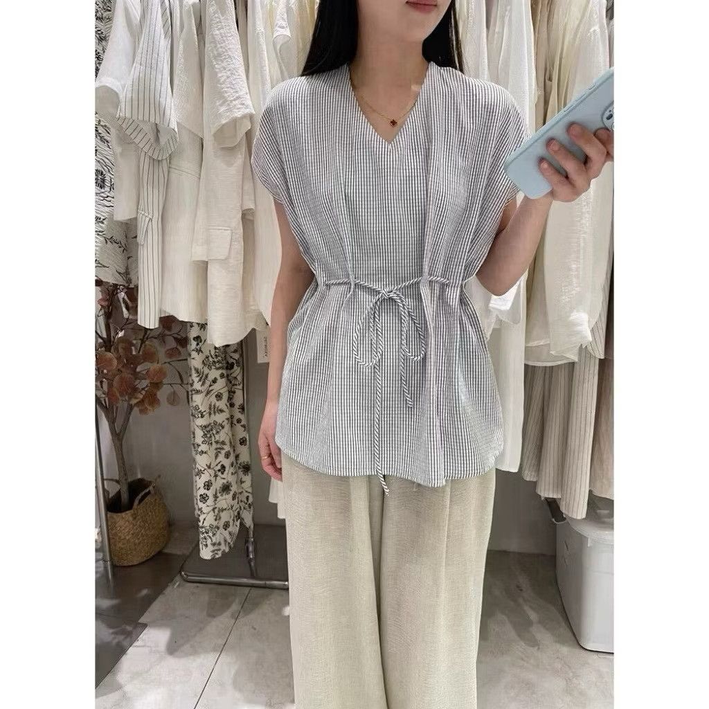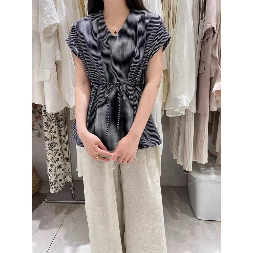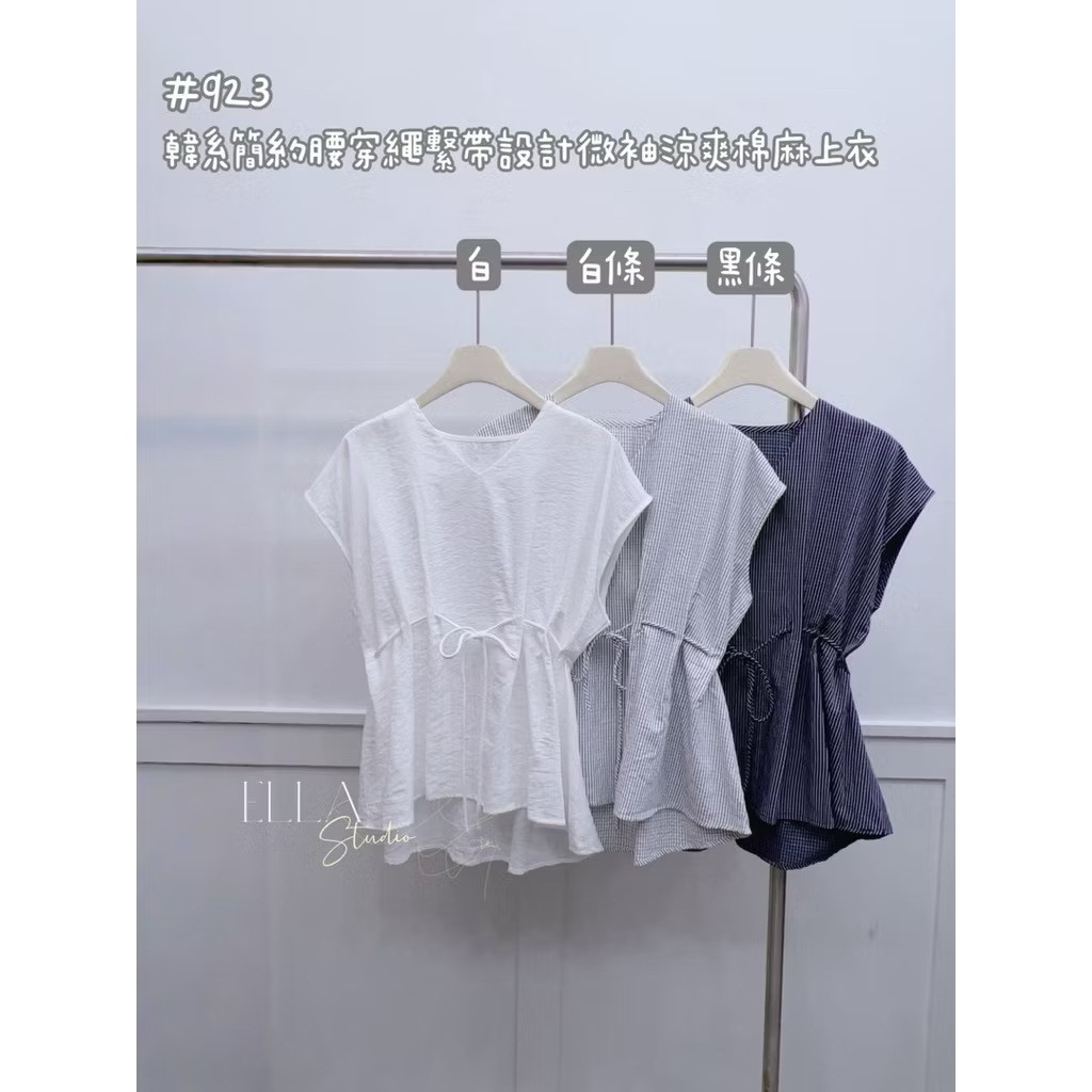韓系簡約腰穿繩繫帶設計微袖涼爽棉麻上衣
